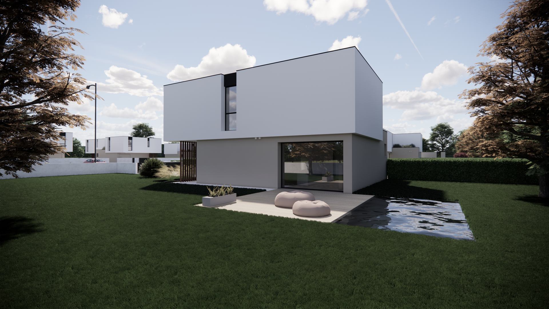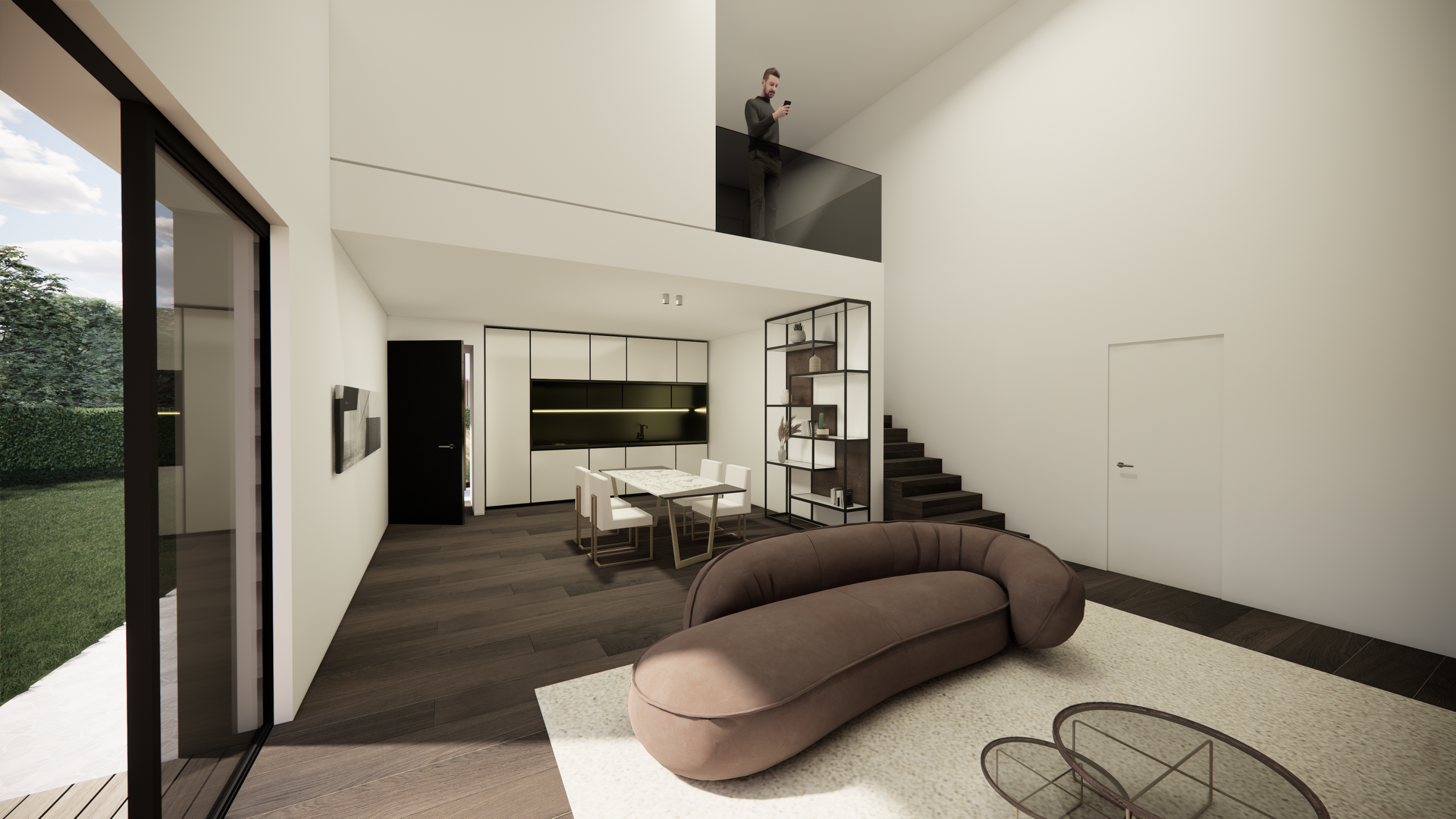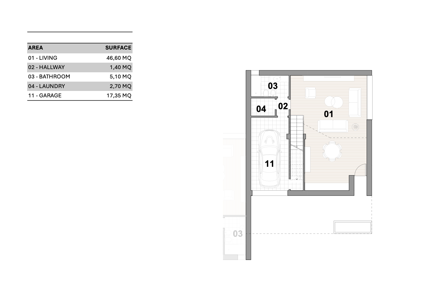 AAl piano terra un'ampia zona living open-space che comunica con lo spazioso giardino esterno tramite la vetrata, completano il piano un bagno giorno e un disimpegno, inoltre un garage con accesso diretto alla residenza. Si accede alla zona notte del piano superiore attraverso una scala con gradini rivestiti in legno.