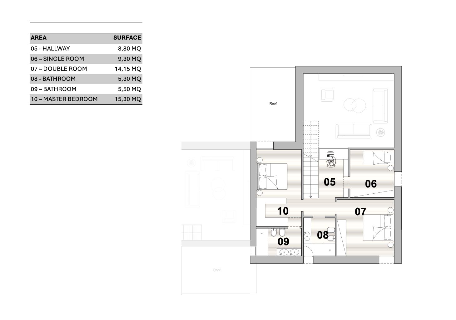 Nella zona notte un ampio disimpegno con ballatoio dove creare un'area relax esclusiva al piano primo che si affaccia nel cuore della villa, la zona living del piano terra, due camere matrimoniali di cui una con cabina armadio e bagno privato, una camera singola ed un ulteriore bagno.