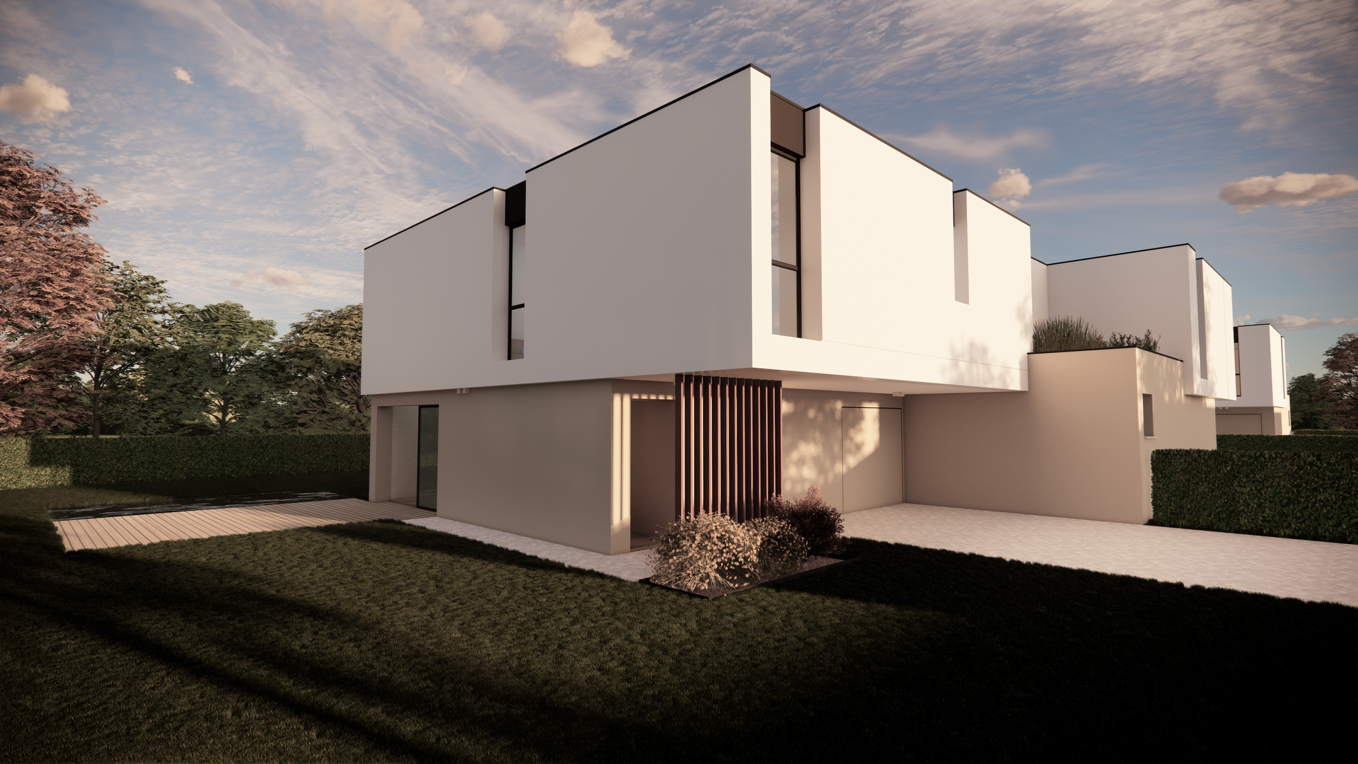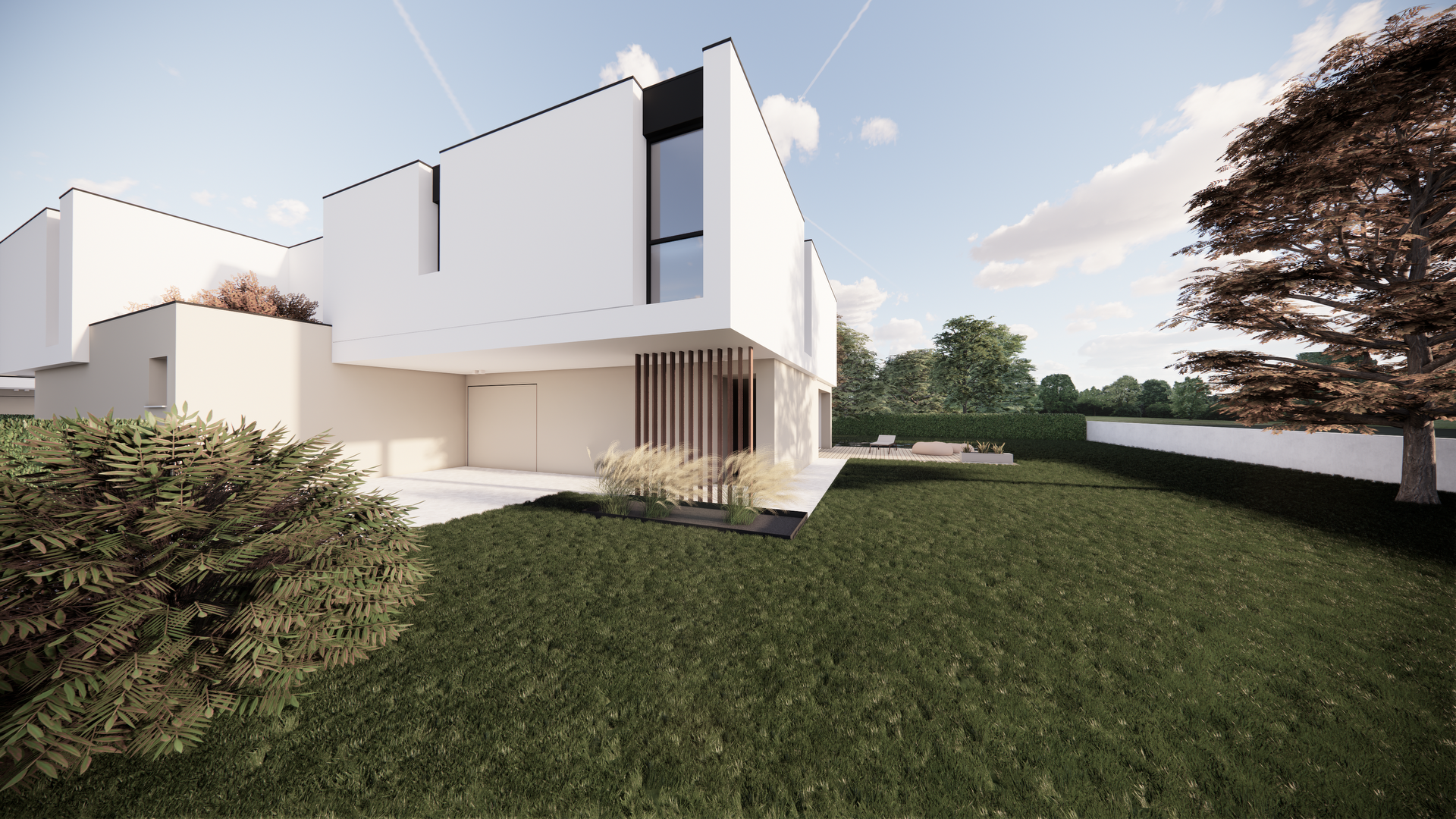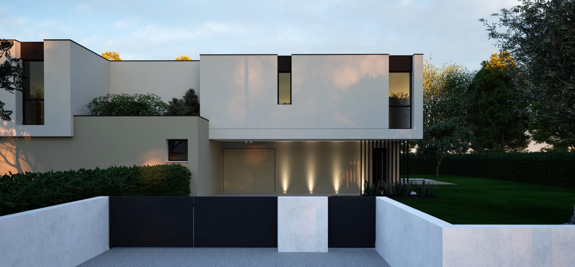 I prospetti sono caratterizzati, al piano terra, da ampia vetrata scorrevole per avere un rapporto diretto tra indoor e outdoor, al piano primo, da eleganti finestre a tutta altezza, gli spazi esterni sono resi esclusivi ed indipendenti permettendo di vivere ambientazioni di riservatezza al pari di una villa singola.