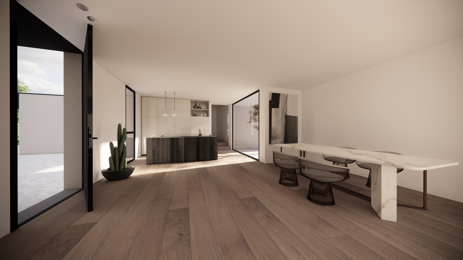 All'interno, l'open-space è come il cuore pulsante dell'amore condiviso. La sala da pranzo, la cucina e l'area living si abbracciano in un abbraccio accogliente, dove le flessibili aree multifunzionali sono come le conversazioni profonde e i momenti speciali condivisi. L'illuminazione soffusa, come una candela accesa in una cena romantica, aggiunge una sensazione di intimità e comfort.